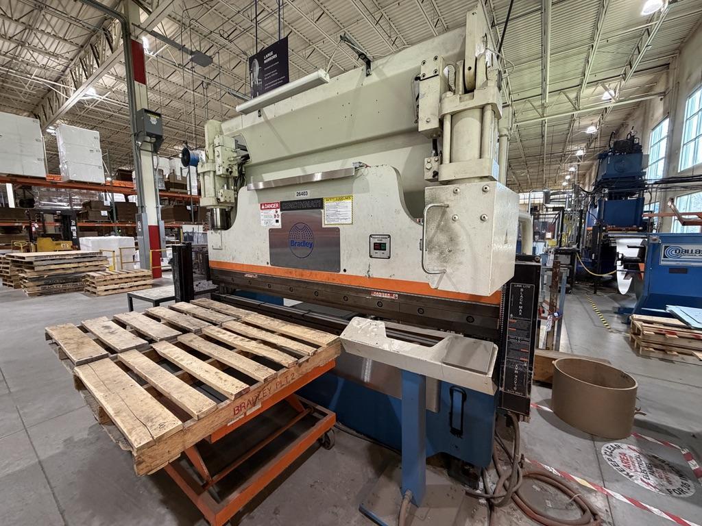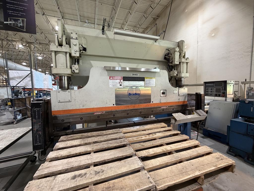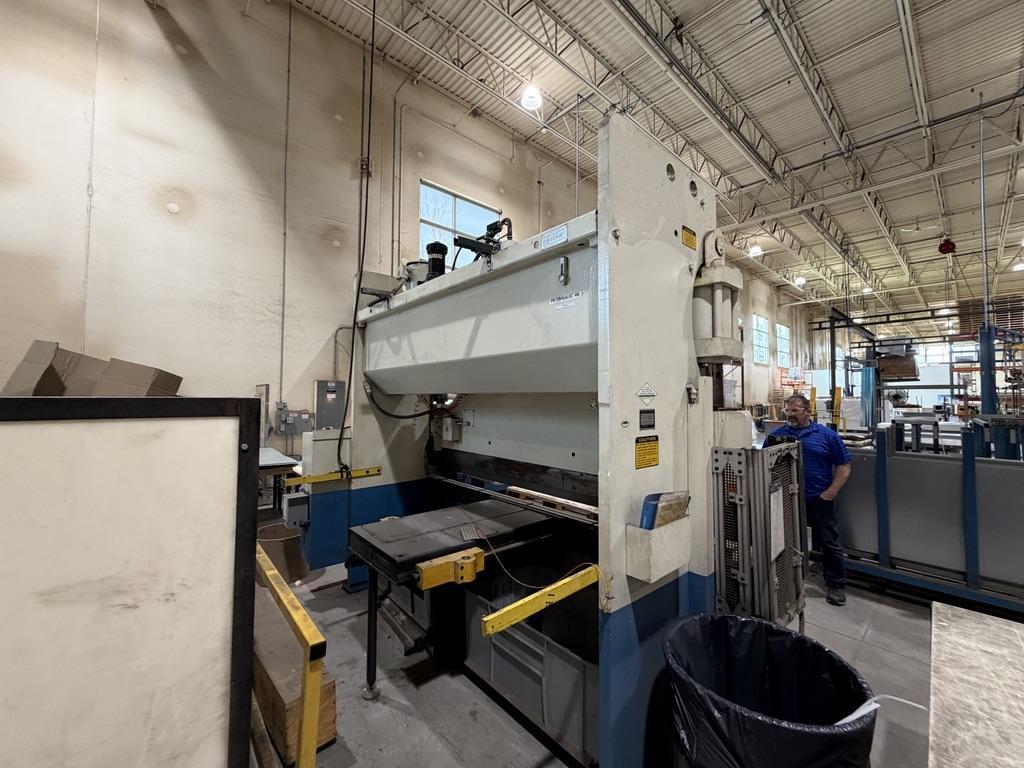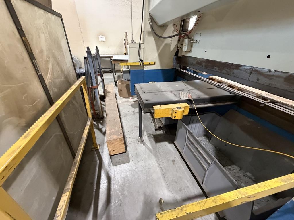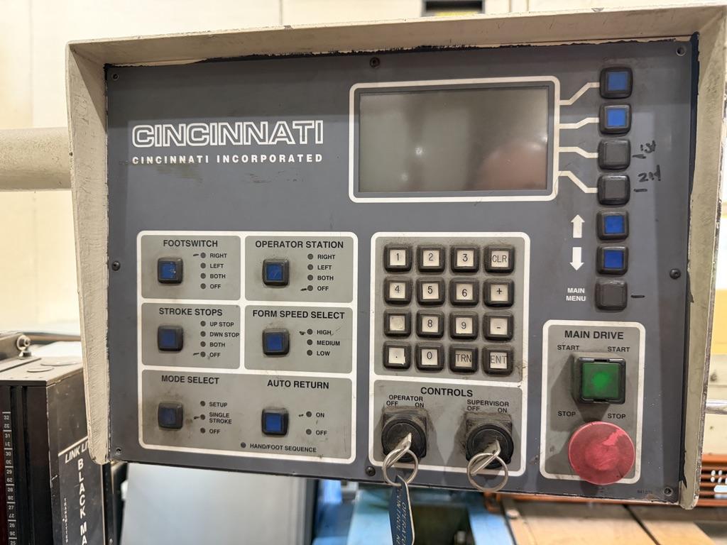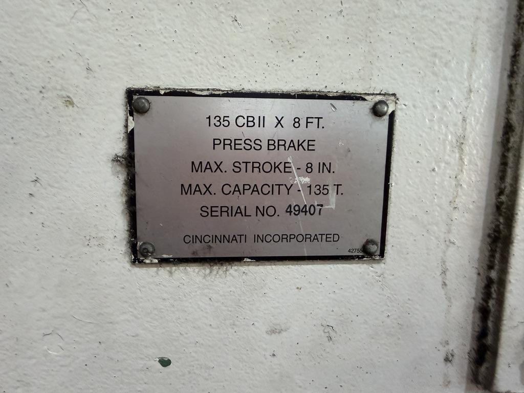 Manufacturer............. CINCINNATI Model.................... 135 CBII X 8 Serial#.................. 049407 Age approximately........ 1996 Tonnage.................. 135 Capacity (Air Bend)...... 1/4" x 7'6" Mild Steel Length of Bed and Ram.... 120" Distance Between......... 102" Ram Stroke............... 0"- 8" Open Height.............. 15" Closed Height............ 7" Ram Speeds: (Approach)... 200 IPM (Bend)....... 10/20/55 IPM (Return)..... 185 IPM Throat................... 7" Horsepower............... 15 Wire..................... 460/3/60 Weight Approximately..... 19,000 lbs Equipped With: 3 Position Electric Foot Switch Cincinnati Force Master control Micro crowned Bed Cross C slots in bed Control needs repair or replacement |